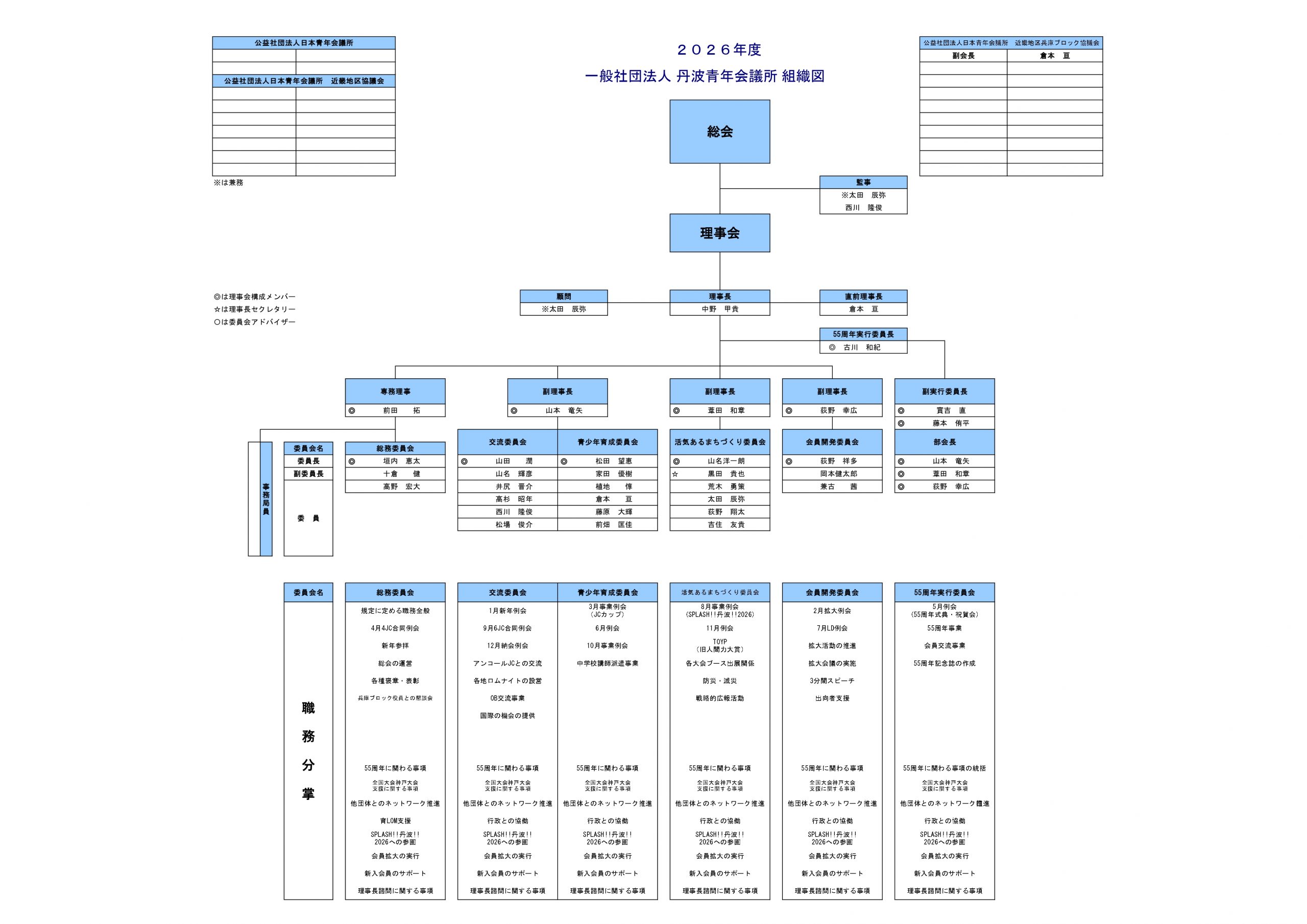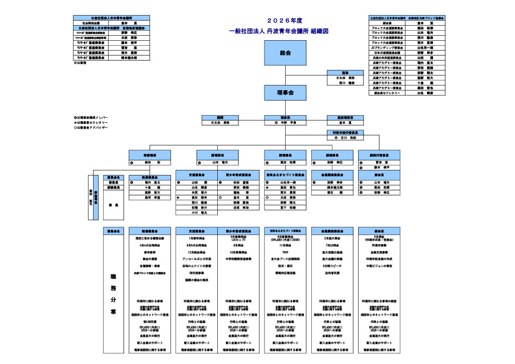 1951年には全国的運営の総合調整機関として日本青年会議所(日本JC)が設けられ、丹波青年会議所は1972年、全国で512番目に誕生しました。その後も、各地に次々と青年会議所が誕生し、現在、日本全国に約700の青年会議所があり「奉仕」「友情」「修錬」の三つの信条のもと、30,000人を超える会員がよりよい社会づくりをめざし、ボランティアや行政改革等の社会的課題に積極的に取り組んでいます。